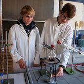 Die 5bR präsentierte den Besuchern einen englischen Sketch. Der Fachbereich Mathematik hatte etwas Besonderes vorbereitet. Über ein Quizspiel konnten die Teilnehmer dem Welternährungsprogramm der Vereinten Nationen jeweils 10 Reiskörner für eine richtige Antwort übermitteln. Am Ende der Veranstaltung kamen 18340 Reiskörner zusammen, das sind umgerechnet 18 kg Reis für hungernde Kinder unserer Welt. Über die Homepageseite der Schule kann man sich an diesem Spiel beteiligen. Daneben gab es interessante physikalische und biologische Experimente, wie z. B. das Mikroskopieren, und der Fachbereich Chemie demonstrierte Unterrichtsinhalte.
