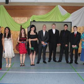 108 Schülerinnen und Schüler aus einer Hauptschul-, einer SchuB- und drei Realschulklassen schritten zu „Final Count Down“ über einen roten Teppich und unter großem Beifall durch die Halle zu ihren Plätzen. Durch das abwechslungsreiche Programm führten Luana Comodari 10cR und Florian Balog 10aR. Auch dieses Jahr hatte sich eine Gruppe von engagierten Schülerinnen schon zu Schuljahresbeginn zu einem Festkomitee zusammengeschlossen, um sich ausreichend und intensiv um Dekorationsfragen sowie um die Programmpunkte zu kümmern. Herausgekommen war eine dezente und feierlich anmutende mit vielen Pflanzen sowie Lichteffekten bestückte Dekoration.