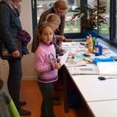 Informationen zur Nachmittagsbetreuung wurden in der Schüler-Lounge präsentiert. Im gut ausgestatteten Werkraum konnten die Besucher verschiedene Holzarbeiten bestaunen sowie selbst verschiedene Laubsägearbeiten ausprobieren. Nicht nur Schüler nutzten dieses Angebot, auch Väter und Mütter widmeten sich begeistert diesen Aufgaben, wobei sich phasenweise lange Schlangen vor den einzelnen Werkbänken bildeten. Abgerundet wurde die Präsentation der pädagogischen Schwerpunkte durch die Vorstellung der Berufsorientierung bzw. Berufswegeplanung der Schule, anschaulich demonstriert im Bereich der Ernährungslehre und der Mitmachaktion „Plätzchen backen“. Mit einem konkreten Einblick in das neue Fach „Digitale Schultasche“ konnte den Besuchern die neuen Aspekte nahe gebracht werden. Die Digitale Schultasche greift die bisherigen PC-Kenntnisse auf und führt nach fünf bzw. sechs Jahren mit dem Erwerb eines Zertifikates zum Europäischen PC-Führerschein. Hilfen beim Umgang mit dem Internet boten die ausgebildeten Medienscouts der Solgrabenschule an. Sie zeigen auf, wo Gefahren für jüngere Schülerinnen und Schüler im Internet sind. Ob Cybermobbing oder der Umgang mit Kindersuchmaschinen, die Medienscouts haben immer einen guten Tipp parat. Gleichzeitig präsentierte die Schule die neue schulische Austauschplattform „wtkedu“, was sich als ein Lernmanagementsystem des Wetteraukreises für die Schulgemeinde und die angeschlossene Partnerschule „Berufliche Schulen am Gradierweg“ darstellt, um schnell und sicher an Informationen zu gelangen. Der absolute Publikumsmagnet war jedoch die Präsentation der neuen Mittelstufenform in der Aula. Schulleiter Gerd Berlau und sein Stellvertreter Jörg Mathes demonstrierten anschaulich das Konzept der Schule und die sich verändernden Inhalte im laufenden Schuljahr. Praxisnah standen die drei Klassenlehrer Rede und Antwort in den eigens für diesen Jahrgang hergerichteten Räumlichkeiten. Mit der Mittelstufenschule will die Solgrabenschule durch ein längeres gemeinsames Lernen (Klassen 5-7 bilden eine Einheit) den individuellen Entwicklungen mehr Zeit und Raum geben. In kleineren Lerngruppen und unter der Schwerpunktsetzung der Hauptfächer ist die individuelle Förderung und Begleitung möglich. Sechs Wochenstunden für jedes Hauptfach (Deutsch, Mathematik, Englisch) zeigen konkret, welchen Schwerpunkt die Schule hier setzt. Fächerverbünde und Jahrgangsteams runden den ganzheitlichen Ansatz ab. In praxisnahen Lernsituationen erlangen die Schülerinnen und Schüler selbstständige Lern- und Handlungskompetenzen. Die Schüler dort abholen, wo sie ganz individuell stehen und ihnen unterschiedliche Möglichkeiten zur Weiterentwicklung anzubieten, ist ein Motivationsfaktor für die Schülerschaft, aber auch eine Herausforderung an die Lehrkräfte. Es macht nun einmal einen Unterschied, ob grammatikalische Strukturen erklärt und geübt werden, oder ob man mit dem Projekt eine eigene Zeitungsseite zu gestalten, mehr erreicht. Genau diese präsentierten die 5.Klässler mit viel Stolz. Ausgehend von der Wetterauer Zeitung „Meine Seite“, die Weltthemen kindgerecht darstellt, gestaltete der Jahrgang in Kleingruppen eine persönliche Zeitungsseite wie „Clever Kids“ oder „Unser Wissen“. Eine saubere und fehlerfreie Gestaltung versteht sich hier von selbst. Auch der Zugang zur Mathematik oder Englisch zeigte, wie abwechslungsreiche Lernstrategien hier eine motivierende Grundlage darstellen. Zusätzlich zu den Klassenräumen kann der Jahrgang auf ein Lernatelier zugreifen. Hier sind verschiedene projektorientierte Lernarrangements möglich.