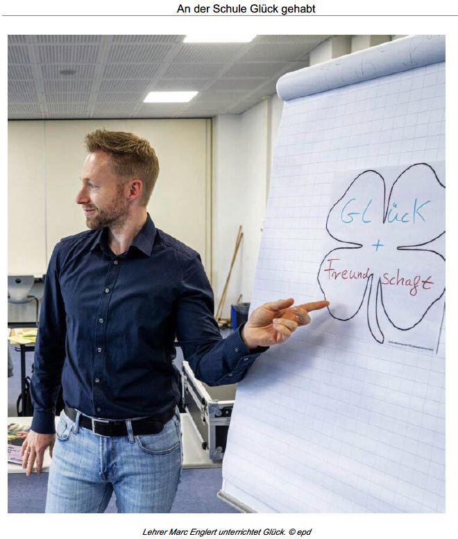 Oberpfalz die Einführung des Faches „Persönliche Entwicklung“ an Berufs- und Wirtschaftsschulen. Nach dem Erfolg an Tiroler Schulen ist an der Pädagogischen Hochschule Tirol in Innsbruck ein Fortbildungsstudium für Pädagogen unter dem Namen „Stark fürs Leben“ eingerichtet worden. Um die Schüler dafür zu sensibilisieren, was glücklich machen kann, erarbeitet Marc Englert mit ihnen einen Tagesplan: Der Gang mit dem Hund, der Sport, das Treffen mit einem Freund – „an jedem Tag gibt es etwas, das Freude macht“, sagt er.