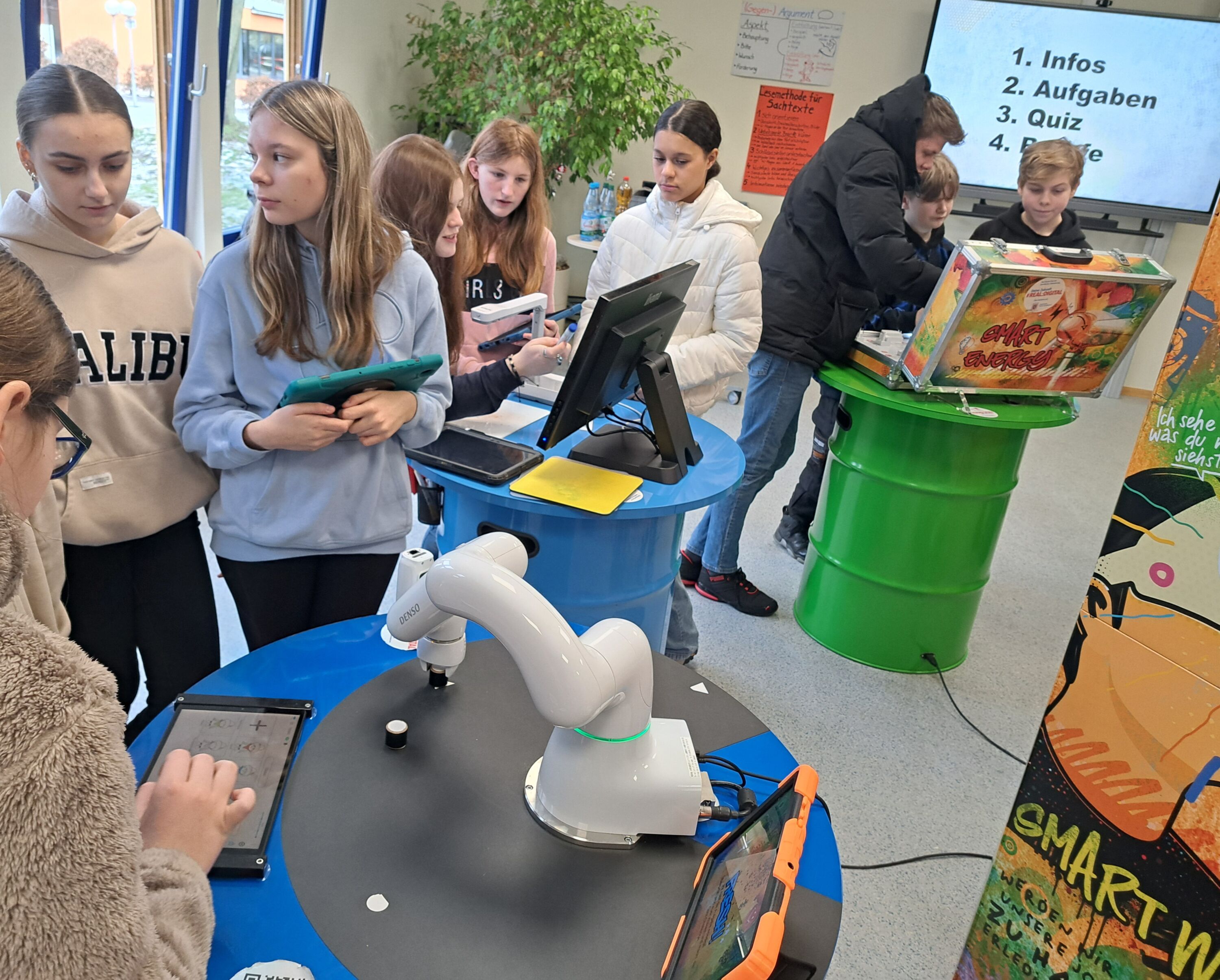 Kürzlich machte die Hessentour von „Deine Zukunft #REAL:DIGITAL“ Halt in Bad Nauheim an der Solgrabenschule. An zwei Tagen konnten Schülerinnen und Schüler des achten Jahrgangs sich ein Bild davon machen, wie sich die Berufs- und Arbeitswelt immer stärker verändert. Um Schülerinnen und Schüler darauf vorzubereiten und bei ihnen ein Verständnis dafür zu schaffen, dass digitale Anwendungen die Voraussetzung für wichtige Lösungen der Zukunft sind, hat Hessen ein neues Informations- und Mitmachangebot zur beruflichen Orientierung an Schulen gestartet – „Deine Zukunft #REAL:DIGITAL“. „Das Besondere an der Initiative „Deine Zukunft #REAL:DIGITAL“ ist, dass junge Digital-Coaches mit dem mobilen Angebot direkt zu den Schülerinnen und Schülern ins Klassenzimmer kommen. In 90-minütigen Workshops lernen die Jugendlichen der Jahrgangsstufen 8 bis 12 unterschiedliche digitale Werkzeuge und Schlüsseltechnologien kennen und wenden sie direkt an. An interaktiven Stationen zu Themen wie Mobilität, Gesundheit, Lernen oder Energie erkunden Schülerinnen und Schüler praxisnah, welche Rolle Technologien für viele Berufsbilder und insbesondere die duale Berufsausbildung spielen“, so der konkrete Wortlaut der Homepage des Hessischen Kultusministeriums. Besondere Themengebiete dabei waren u.a. Künstliche Intelligenz, Augumented Reality sowie Kollaborative Robotik. „Es ist nicht nur für Schülerinnen und Schüler interessant zu sehen, wie sich die Berufswelt verändern wird. Die Veränderungen beginnen bereits beim klassischen Handwerk und das machte diese Zweige wiederum reizvoll für beide Geschlechter und auch Heranwachsende, die diese Berufsbilder gar nicht auf dem Schirm hatten“, so der stellvertretende Schulleiter Herr Englert nach seinem Rundgang.