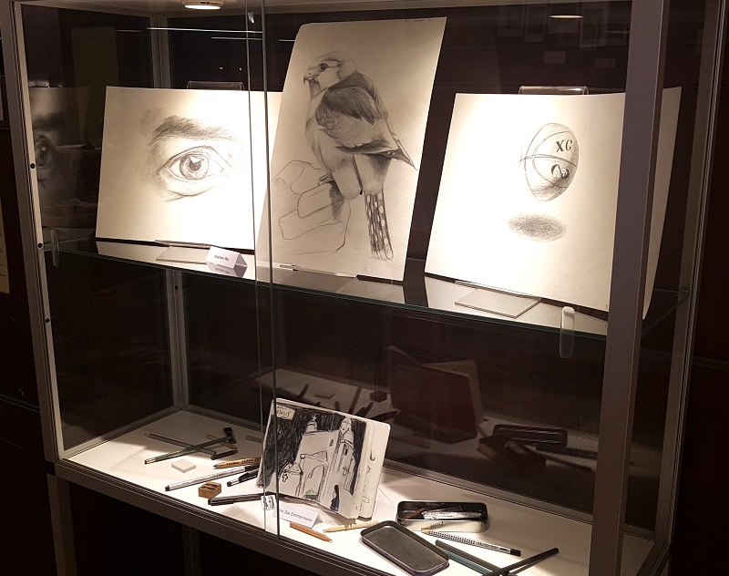 Eine Auswahl dieser Bilder ist bis Ende März 2020 in der Stadtbücherei zu sehen. Auch befinden sich Bleistiftzeichungen von Xinchen Wu, sowie ein Skizzenbuch von Kim Zoe Zimmermann (beide ebenfalls in der 9. Klasse) unter den Exponaten.