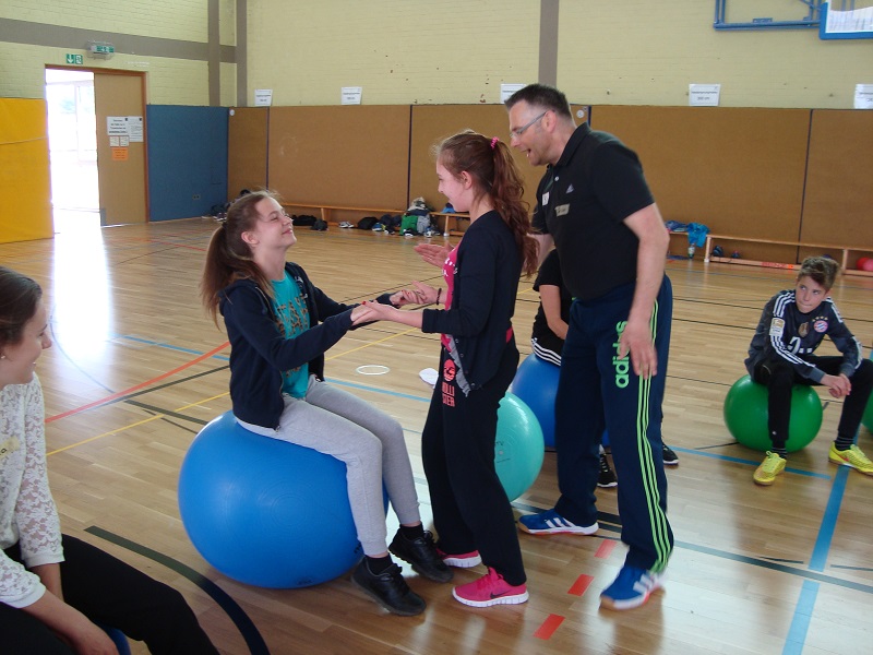 Der Vormittag des Folgetages bot eine Menge Abwechslung für die Schülerinnen und Schüler. Beginnend mit einem Exkurs zur Förderung des Gleichgewichts sowie des geraden Sitzens, welche mit Hilfe eines Bewegungskalenders eingeübt würden, folgte wiederum ein praxisorientierter Vortrag zur Verknüpfung von Bewegung mit ganzheitlichen Lernspielen. Egal ob Fotoapparat, Heiße Kartoffel oder Ping Pong, alle Spiele fördern die Selbstregulationsfähigkeit der Jugendlichen. Ferner übten sie dabei das kreative Denken, die Impulskontrolle sowie ihre Handlungen zu reflektieren und förderten nicht nur die Merkfähigkeit sondern auch ihr strategisch- logisches Denken. Wer sich gesund ernährt und natürlich reichlich Bewegung einbaut, verdient sich ebenso ein wenig Wellness und Entspannung. Dies offenbarte die Firma Luvos aus Friedrichsdorf, welche über die pflegende und reinigende Wirkung von Heilerde referierte. Am eigenen Leib durfte natürlich auch getestet werden, egal ob Gesichtsmaske oder Handpflege, der Spaßfaktor war in jedem Fall sichtlich gegeben. Nach dem Mittagessen erwartete die Solgrabenschülerinnen und -schüler im wahrsten Sinne des Wortes ein Abschluss- HIT und zwar ein High- Intensity- Training in der nahen Sporthalle. Nicht nur die Jugendlichen auch die teilnehmenden Lehrkräfte kamen bei dem knapp einstündigen Workout, welches von einem Dozenten der Sportuniversität Köln angeleitet wurde, an ihr Grenzen. Dieses Workout ist an jedem Ort jederzeit machbar, vielleicht sogar in der schulischen Mittagspause. Unterstützend kann dabei eine, den Gesundheitsbotschaftern vorgestellte App sein, welche Zeit und Intensität vorgibt. Bevor die Zertifikate ausgeteilt wurden, erfolgten abschließend eine Evaluation der Fortbildung sowie eine Vorausschau geplanter Schulprojekte und Regionalveranstaltungen. Der Abschied fiel allen Schülerinnen und Schülern ziemlich schwer, da sich doch in kürzester Zeit neue Freundschaften auch über die eigene Schule hinaus gebildet haben. Die stolzen Gesundheitsbotschafter der Solgrabenschule sprühen nun vor Ideen und teilen gemeinsam die Meinung: „Beim nächsten Mal kommen wir auf jeden Fall wieder mit!“ Finanziell unterstützt wurde die Ausbildung der Solgrabenschülerinnen und -schüler durch Round Table Bad Nauheim.