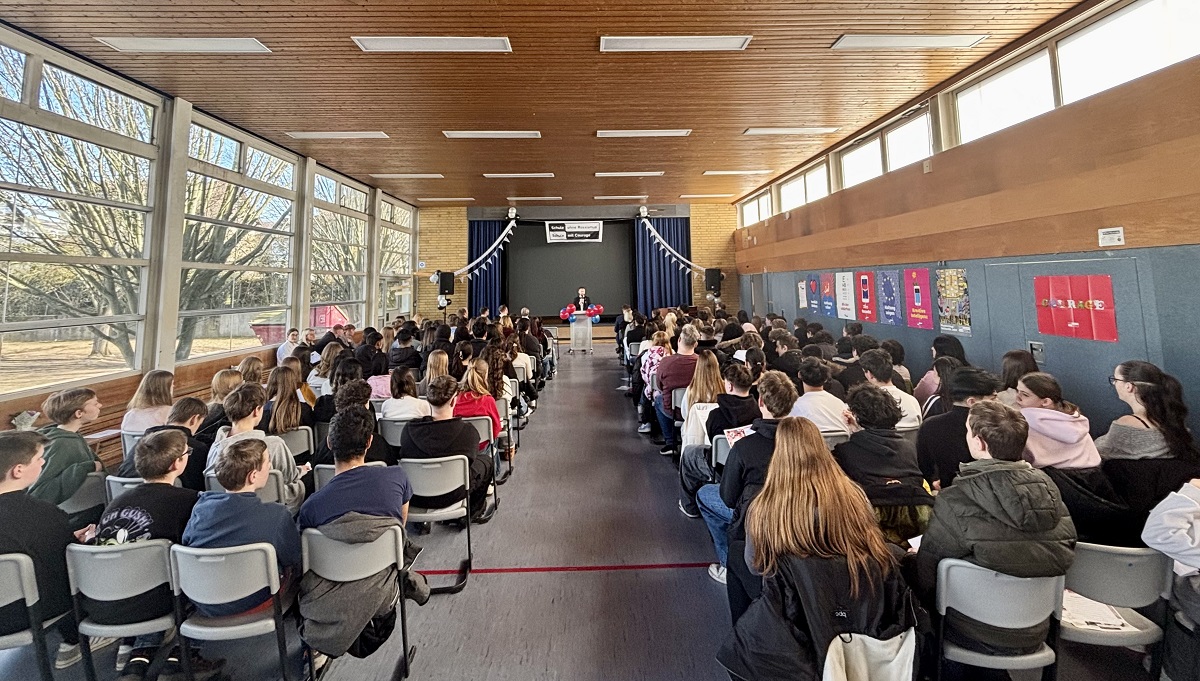 Stellvertretender Schulleiter Herr Englert eröffnete die Veranstaltung und betonte in seiner Ansprache die mit der Auszeichnung verbundene Verantwortung: „Dieser Titel ist nicht nur eine Ehrung, sondern eine Selbstverpflichtung. Wir stehen dafür ein, dass unsere Schule ein Ort bleibt, an dem Diskriminierung keinen Platz hat und Vielfalt aktiv gelebt wird.“