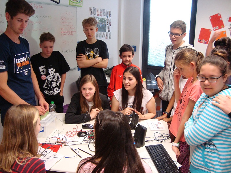 In den rund neunzig minütigen Workshops drehte sich alles um das Programmieren mit Hilfe des Rasperry Pis, einem Minicomputer mit erstaunlichen Fähigkeiten. Die Schülerinnen und Schüler konnten durch geschicktes Programmieren eigene Sounds erstellen, einen Lehrerroboter sprechen lassen und sogar Lichteffekte mit Schriftbild erzeugen. Da aufgrund des Alters und Schwierigkeitsgrades nicht alle Kinder der Solgrabenschule teilnehmen konnten, wurde in den Pausen für ein abwechslungsreiches Programm auch für jüngere Schülerinnen und Schüler gesorgt. An einer Fotowand konnte nach Lust und Laune experimentiert und gelacht werden, während die Hauptattraktion wohl auf die VR- Brillen (Virtual Reality) mit ihren Videoangeboten fiel. Ein absolutes Highlight nicht nur an der Solgrabenschule, sondern auch bei der diesjährigen Spielemesse Gamescom in Köln.