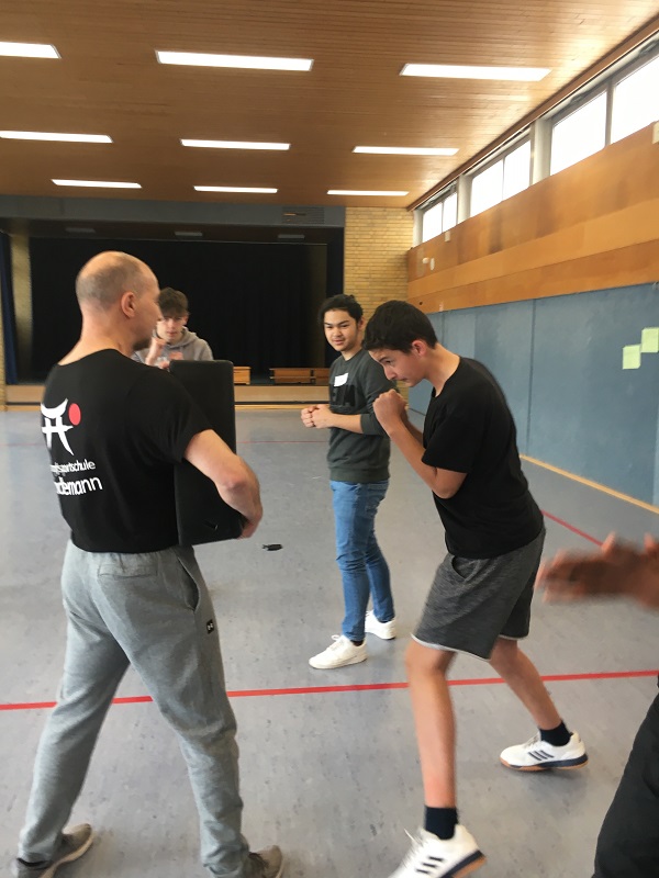 Im zweiten Teil wurde es praktischer. Dank der Unterstützung durch Andreas Lindemann vom Fitnesstreff Lindemann in Bad Nauheim, lernten die Jugendlichen erste Einblicke in das Thema Selbstverteidigung. Die Erfahrung, seinen eigenen Körper bewusst einzusetzen und durch Körpersprache eigene Bedürfnisse zu vermitteln, „waren ganz neue Erfahrungen für“ einige Jugendliche. Dass der Satz „Leider stört ein aufrechter Stand nicht immer den anderen“ stimmt, lernte die Klasse auch handfest in der Praxis. Andreas Lindemann zeigte Griffe und Tricks, um sich selbst zu schützen und verriet, dass nicht nur Technik wichtig sei, sondern ebenso Lautstärke. Aufmerksamkeit erregen, um Hilfe zu bekommen, das Wissen, dass man immer „Nein“ sagen darf, wenn man es selbst möchte und körperlich zu werden, wenn es sein muss, sind Punkte, „die uns geprägt haben“.