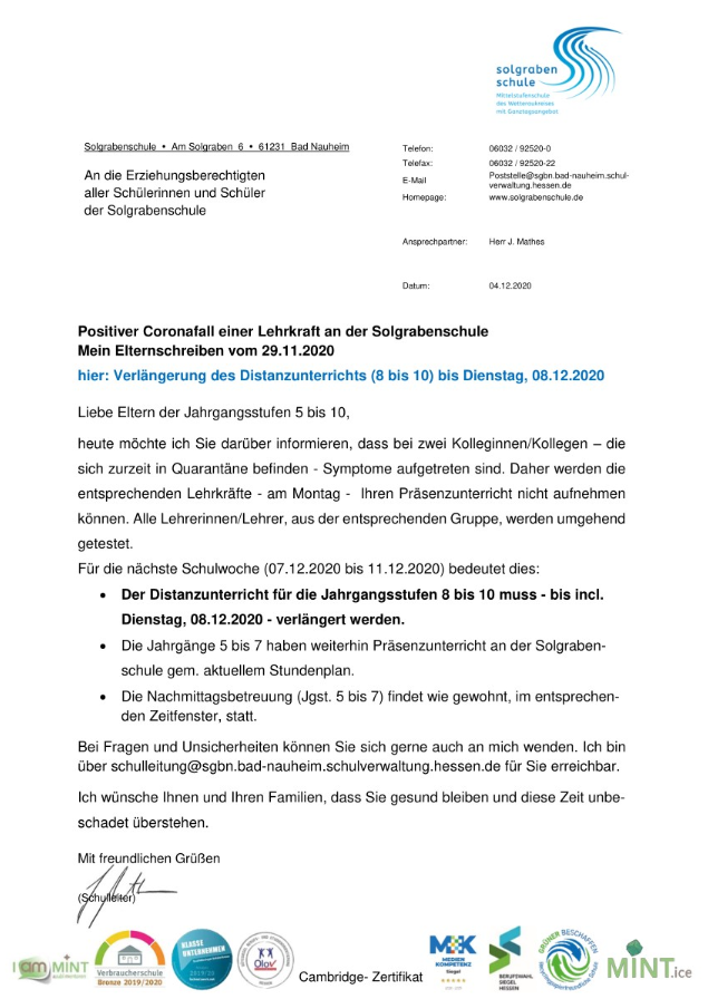 heute möchte ich Sie darüber informieren, dass eine Lehrkraft positiv auf Covid-19 getestet wurde. Wir stehen bezüglich des Falles in sehr engem und intensivem Austausch mit dem hiesigen Gesundheitsamt und dem Staatlichen Schulamt. Die Fallanalyse, die Gefahreneinschätzung und jegliche Maßnahmen wurden und werden auf dieser Ebene besprochen und entschieden. Das Testergebnis liegt seit Samstag vor. Vorab: Meine Mitteilung an Sie hat ausschließlich informativen Charakter, die zur innerschulischen Transparenz und Darlegung der Entscheidungsprozesse beitragen soll. Diese Mitteilung stellt keine „Warnung“ vor einer Gefahrenlage dar! Die Lehrkraft ist bereits seit einer Woche in häuslicher Quarantäne und unterrichtete zuletzt am 20.11.2020. Das Gesundheitsamt hat den Fall intensiv und differenziert begleitet und bewertet. Aufgrund der Sachlage ergibt sich für einen Teil des Kollegiums ein Betretungsverbot für die Solgrabenschule, bis incl. Freitag, 04.12.2020. Des Weiteren befinden sich Kolleginnen/Kollegen, aufgrund von Kontakten im häuslichen Umfeld, in Quarantäne.