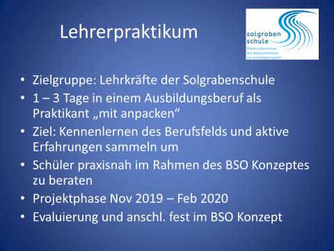 - Mit folgenden Arbeitgebern hat die Solgrabenschule Kooperationen zur Durchführung von Praktika (Stand Dez. 2019). Die Liste unterliegt permanenten Veränderungen, bitte beim BSO Team informieren. Wichtig: Es gibt keine Garantien bei den u.a. Arbeitgebern einen Praktikumsplatz zu erhalten!