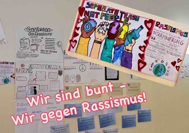 Im Rahmen eines fächerübergreifenden Projekts haben sich die Schülerinnen und Schüler der Klasse 7b intensiv mit dem Thema „Wir sind bunt – Wir gegen Rassismus“ auseinandergesetzt. In den Fächern Ethik und Kunst wurde das gesellschaftlich hochaktuelle Thema aus unterschiedlichen Perspektiven beleuchtet und kreativ verarbeitet.